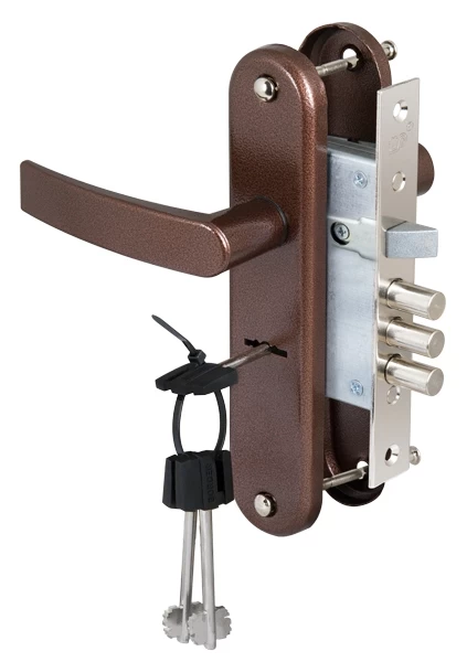 Замок врезной 6-сувальдный ЗВ9-6/13 (КЛП5-85).РФ61-002.Ш3.У4 с защелкой и фалевыми ручками предназначен для установки в двери толщиной 40-50 мм. Замок универсальный, возможна установка как в правые, так и в левые двери. В комплекте: Накладки с фалевыми ручками (покрытие «медный антик»), 3 стальных ключа длиной 70 мм. Замок открывается и закрывается изнутри и снаружи ключом. Дверь может быть закрыта на защелку и открыта с помощью фалевой ручки при открытом сувальдном механизме. Покрытие лицевой планки — цинковое. Замок имеет защиту от высверливания, защиту от отмычек. Изготовлен из высокопрочных материалов. Имеет защитное покрытие. Количество секретных комбинаций - 120 000. Вылет ригелей — 21 мм, диаметр ригеля — 11 мм. Бэксет - 48,5 мм.